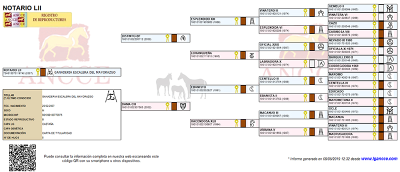 Desciende de líneas genéticas de referencia como Macanuo III, Vinatero III, Oficial XXIX, Hacendosa XLII y Ebanisto, lo que garantiza una transmisión sólida de talla, hueso, nobleza y funcionalidad a sus crías.